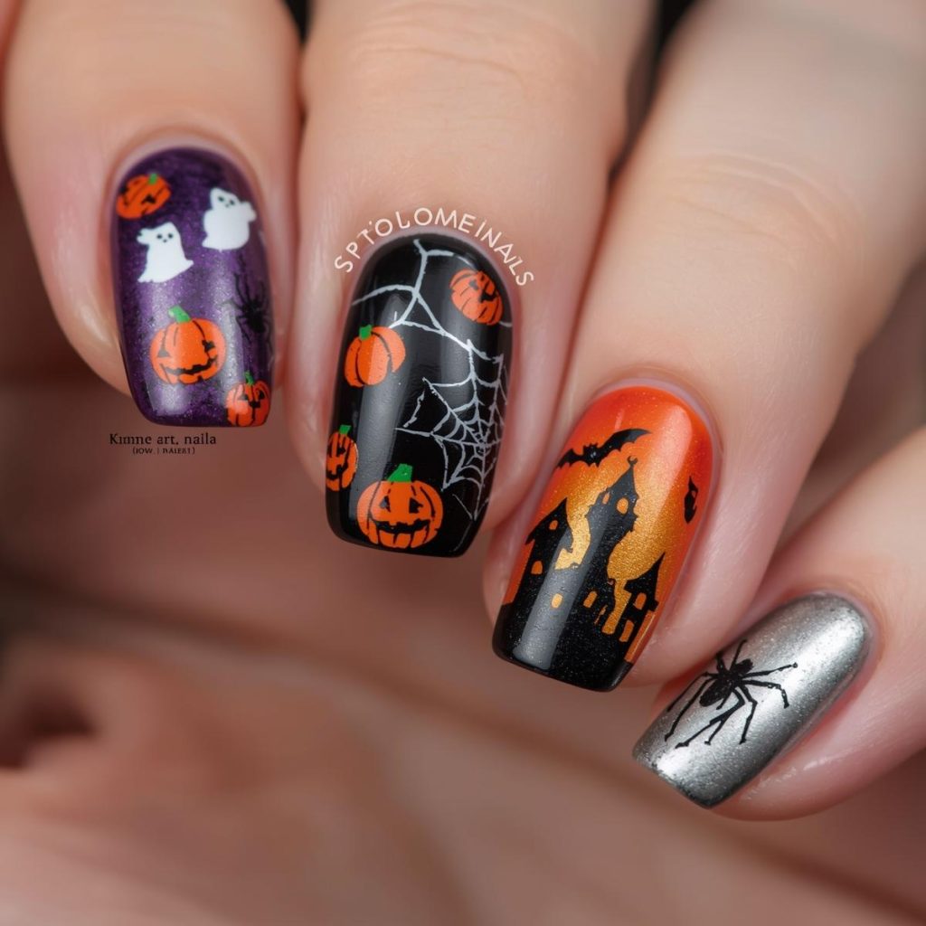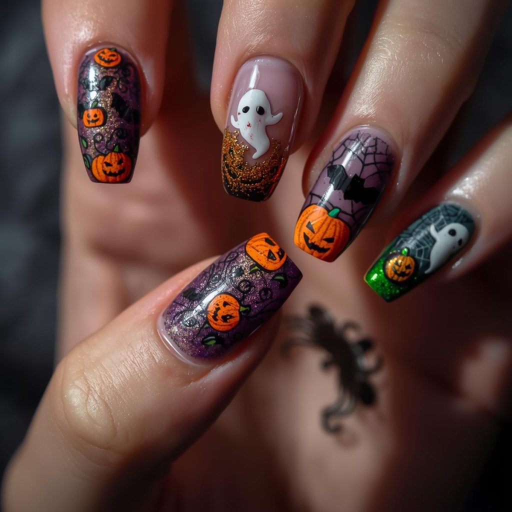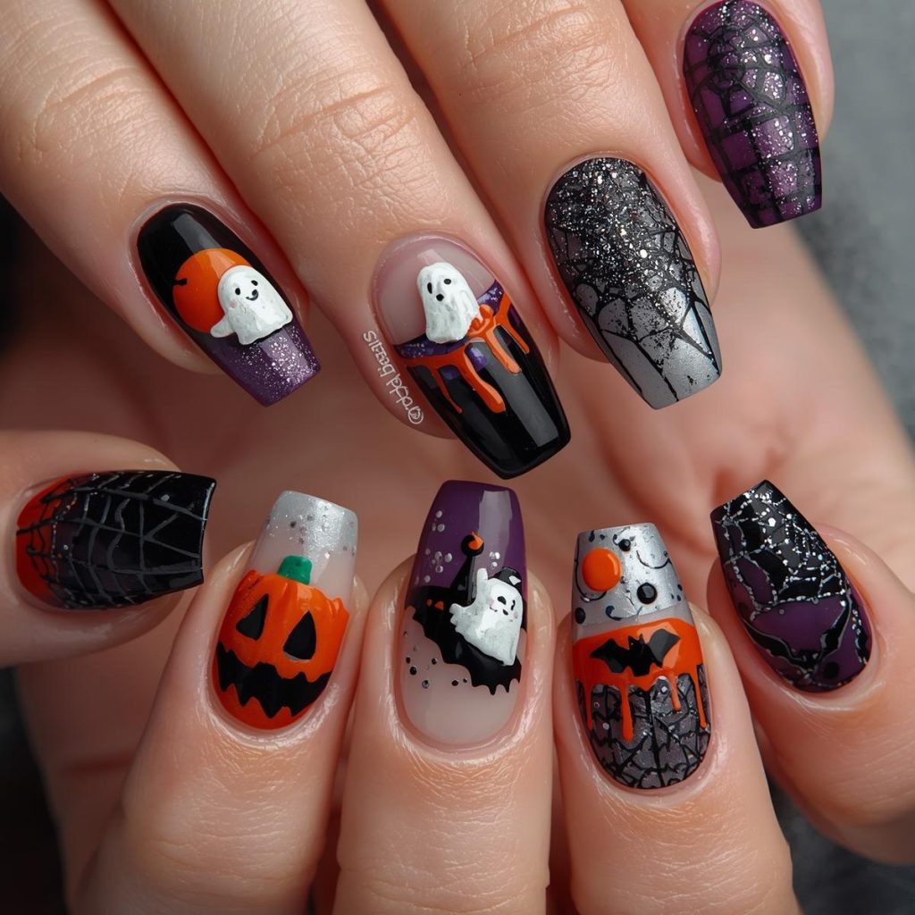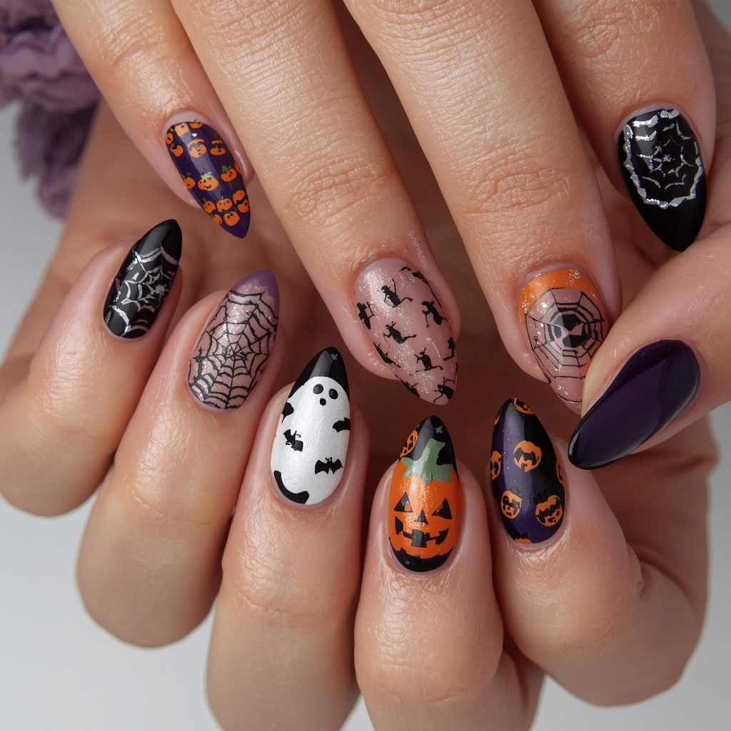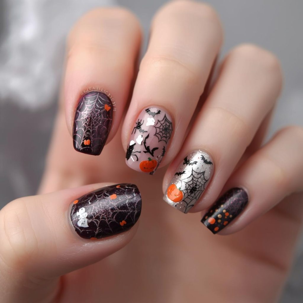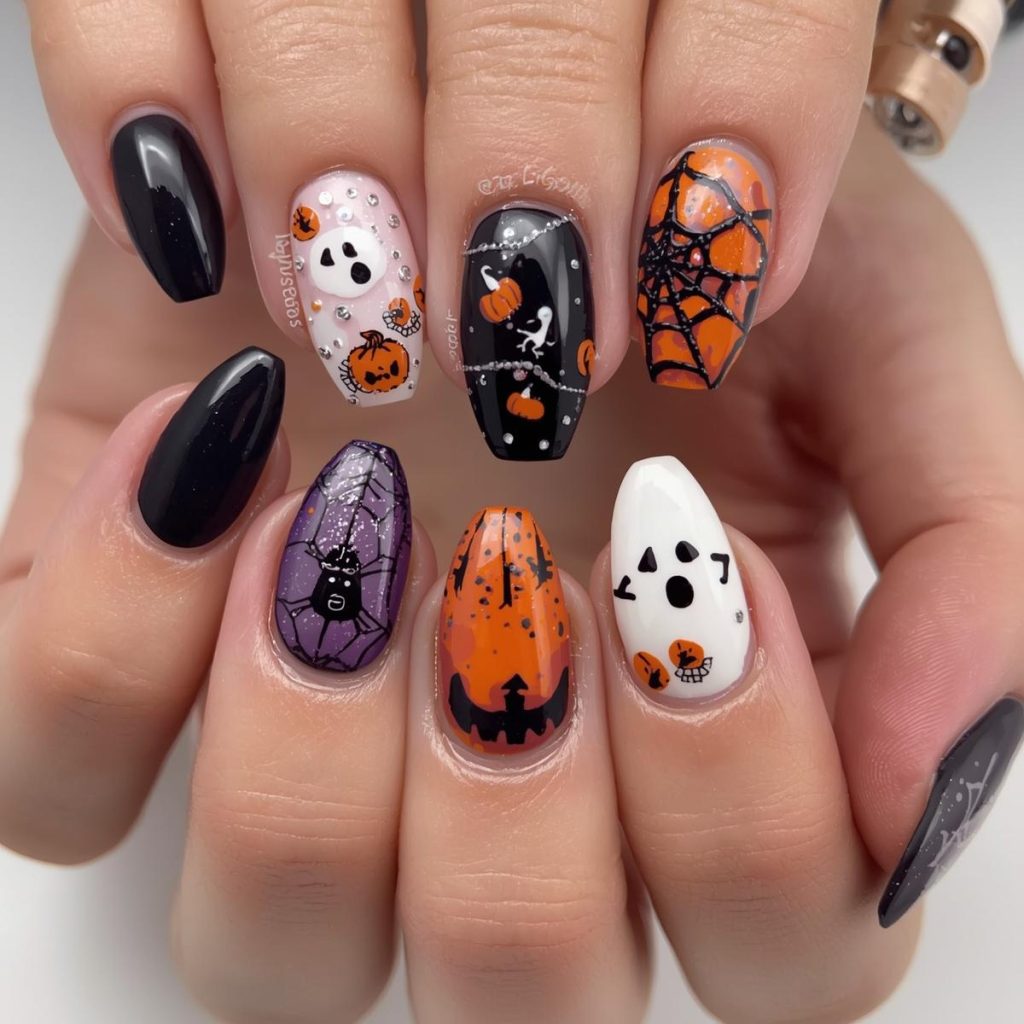• Mismatched Halloween Nails: Each nail with a different design (pumpkin, bat, spider, etc.).
