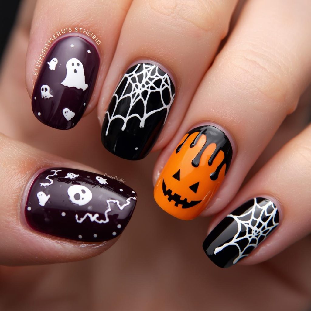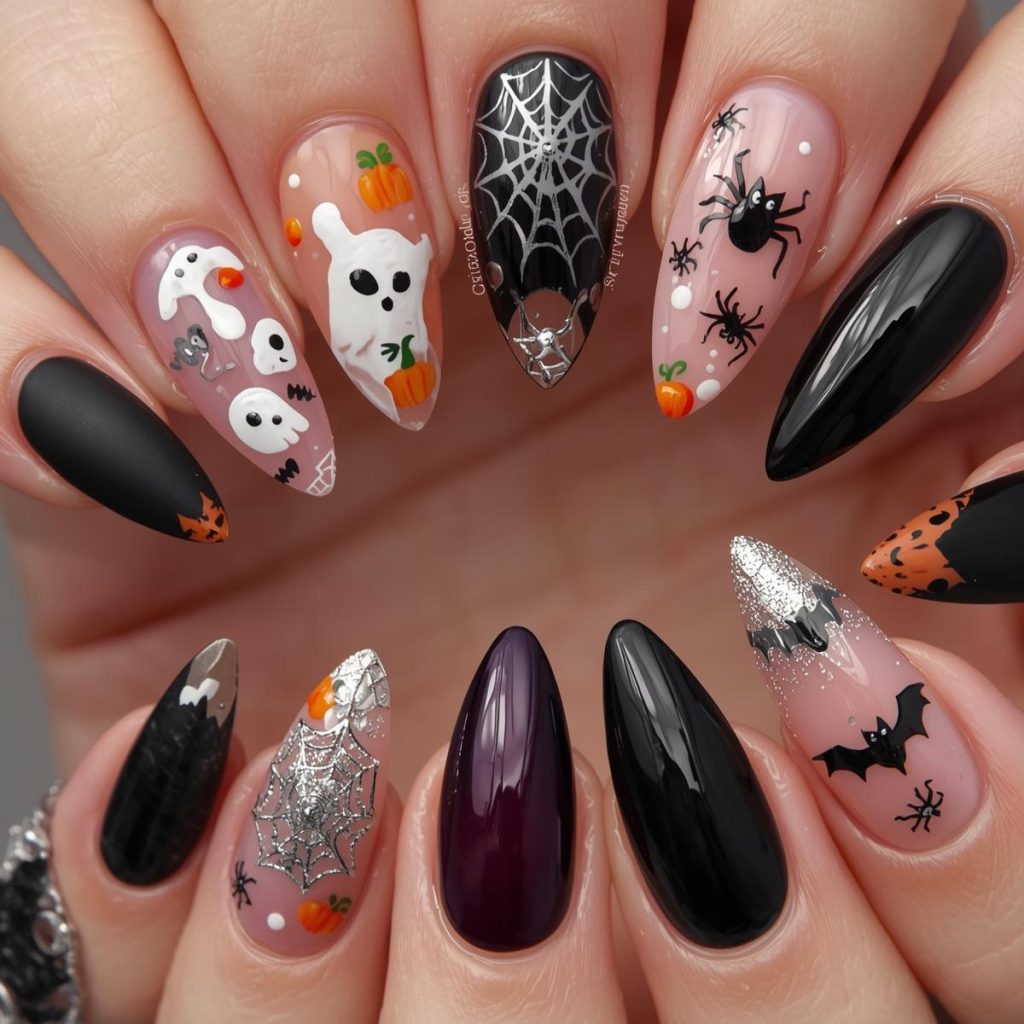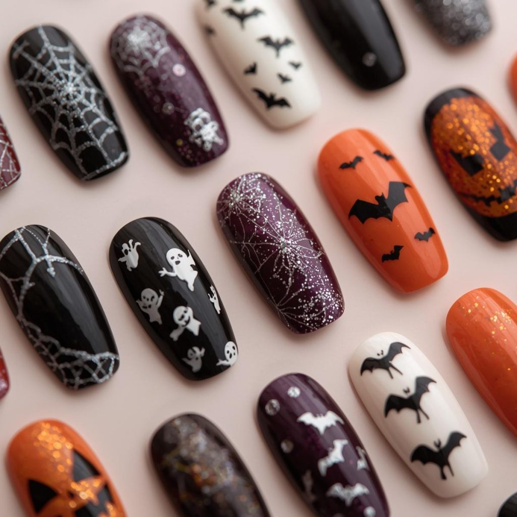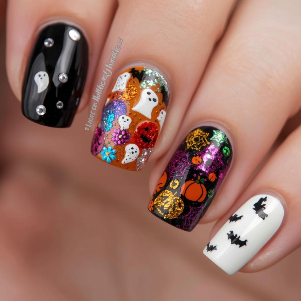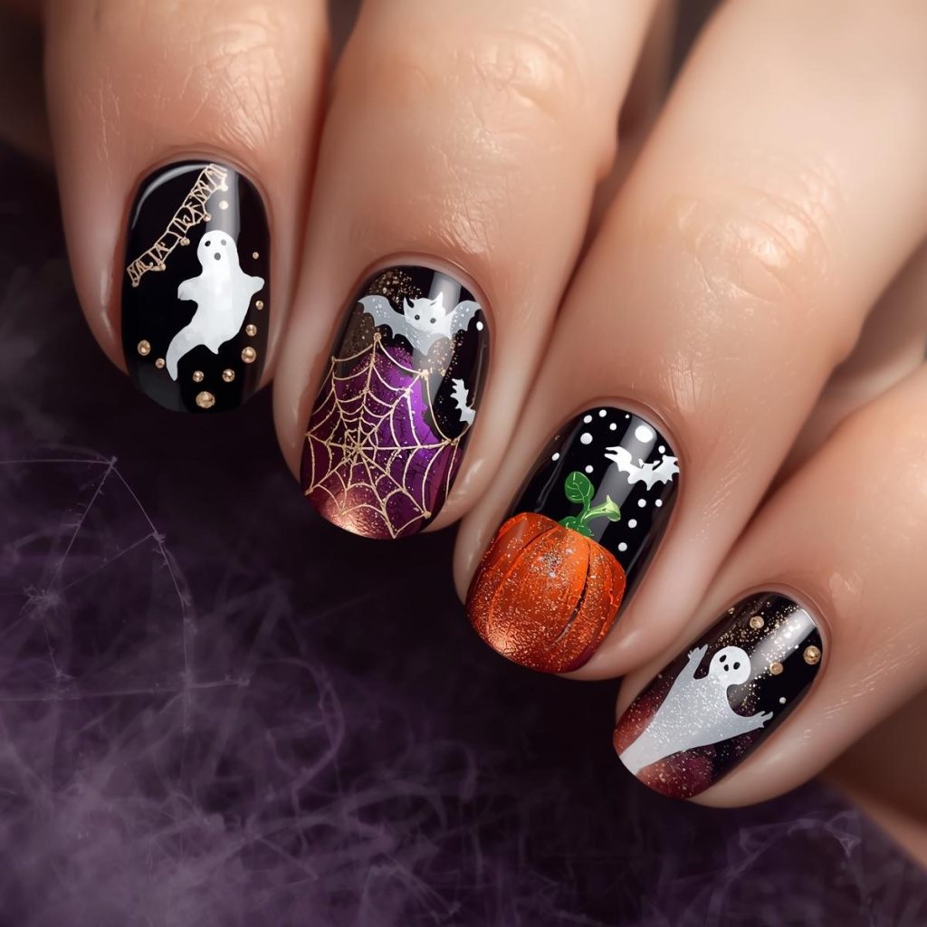 • Mismatched Halloween Nails: Each nail with a different design (pumpkin, bat, spider, etc.).