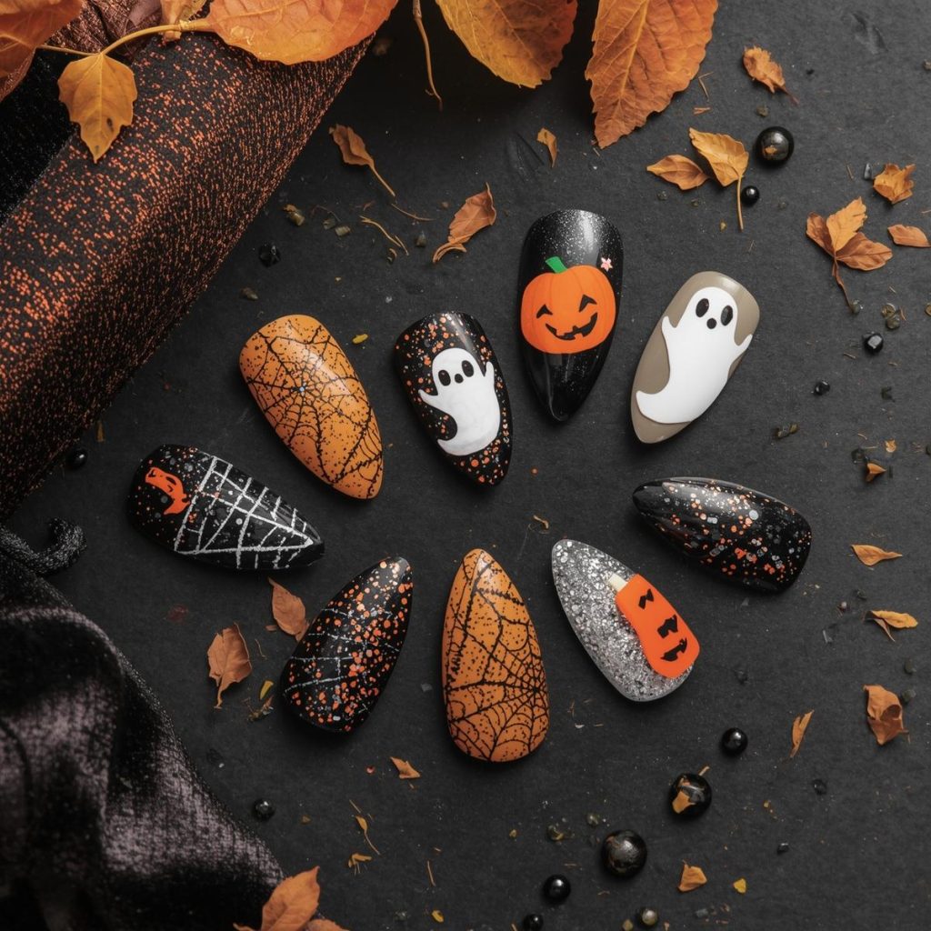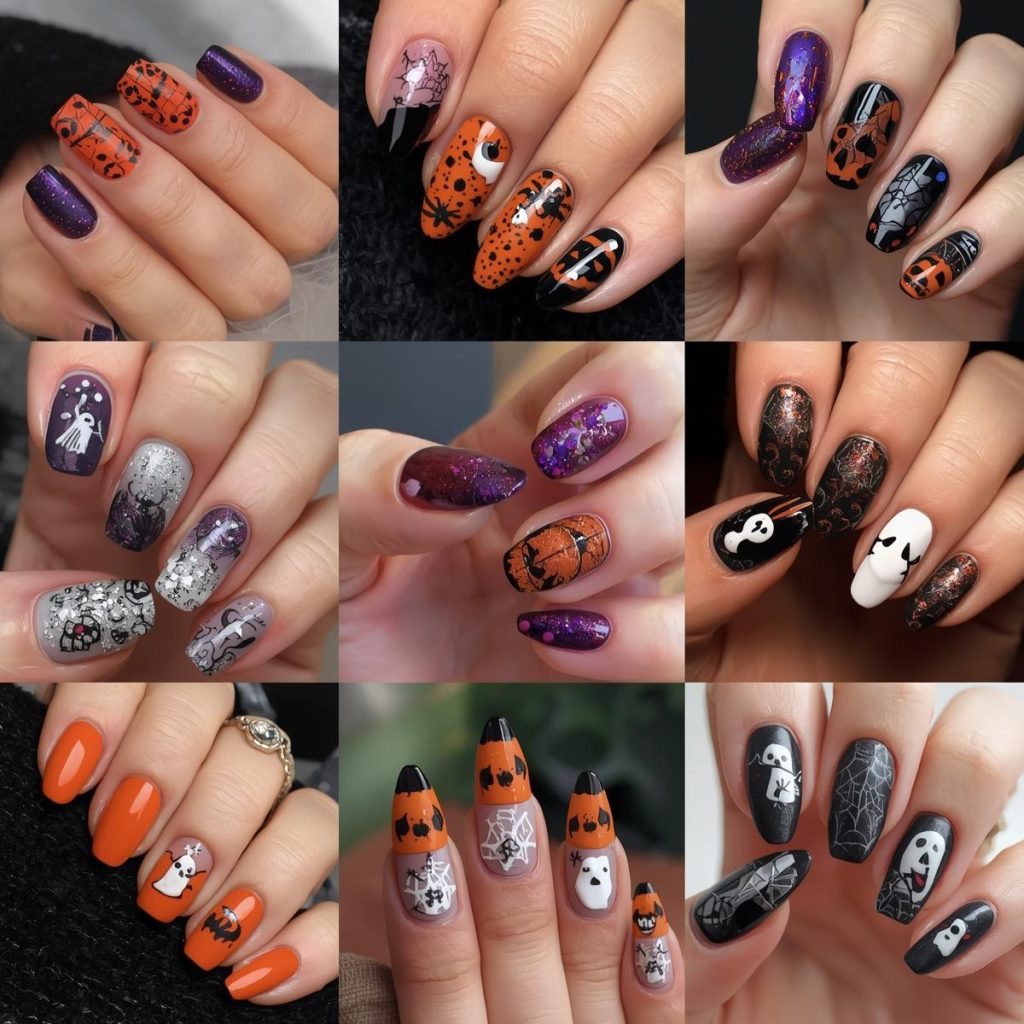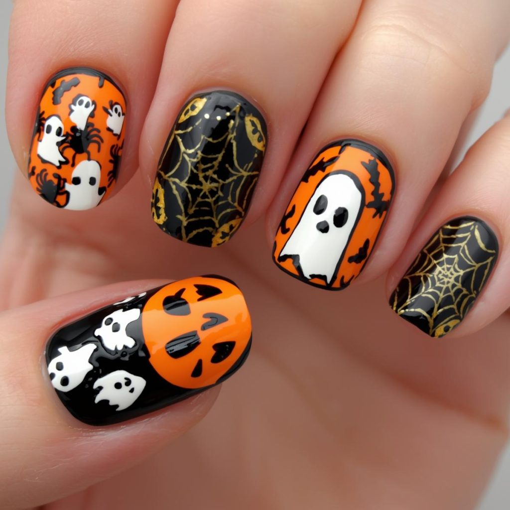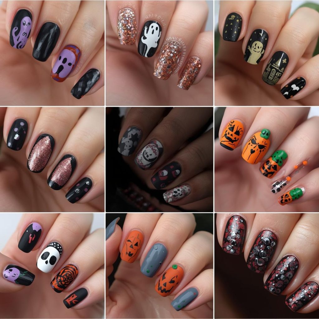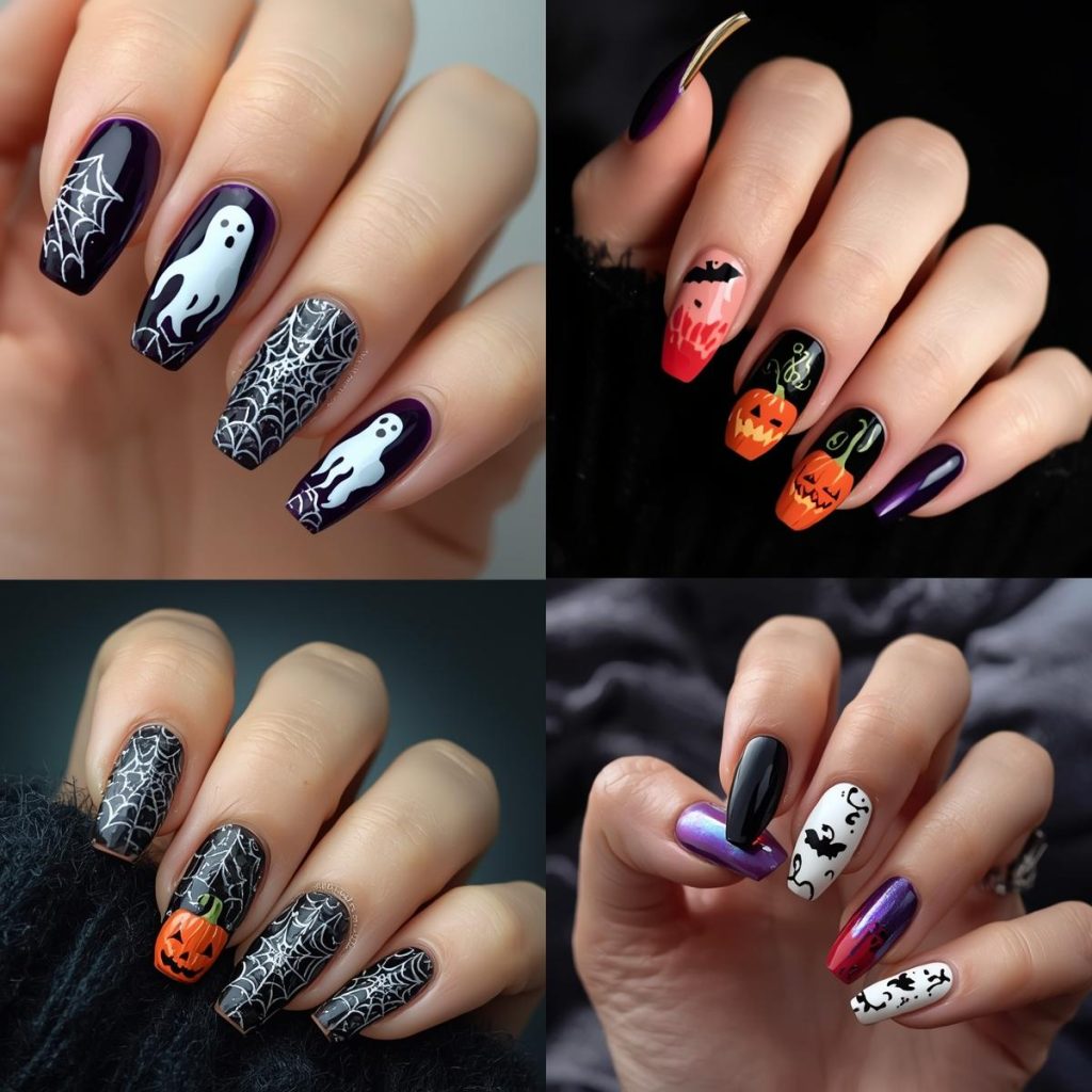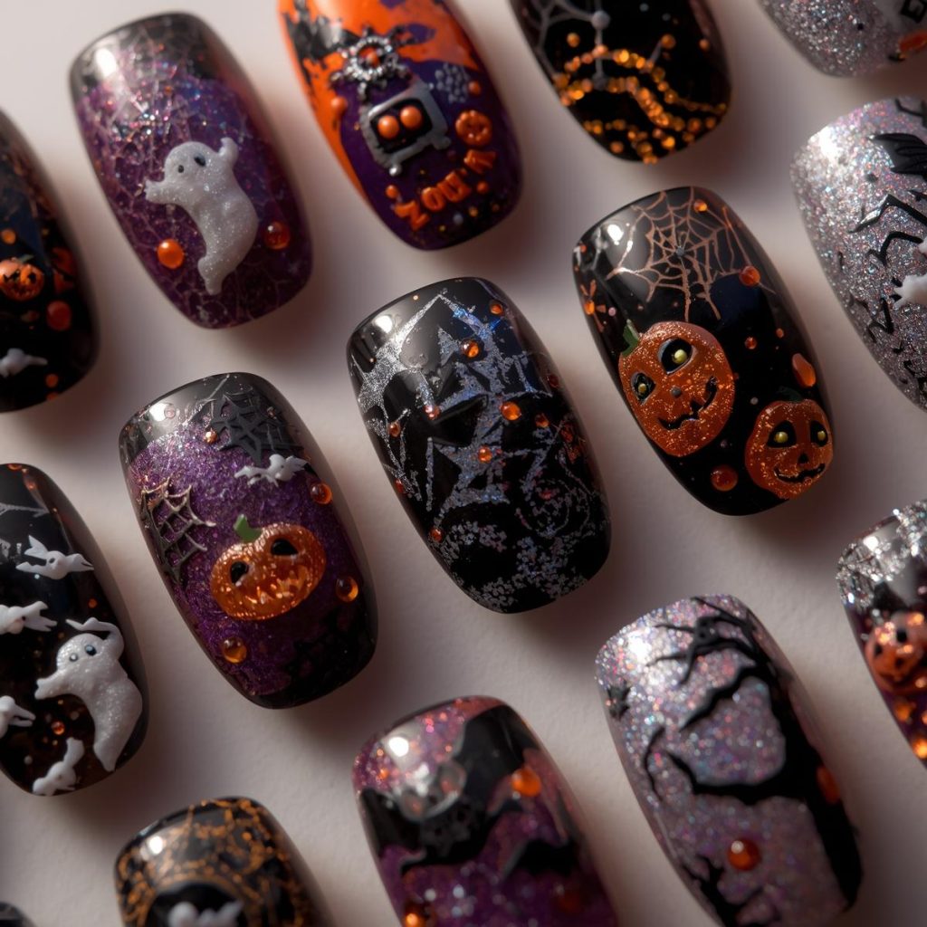 • Mismatched Halloween Nails: Each nail with a different design (pumpkin, bat, spider, etc.).