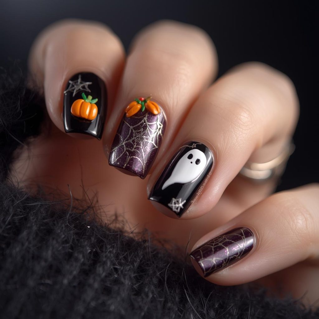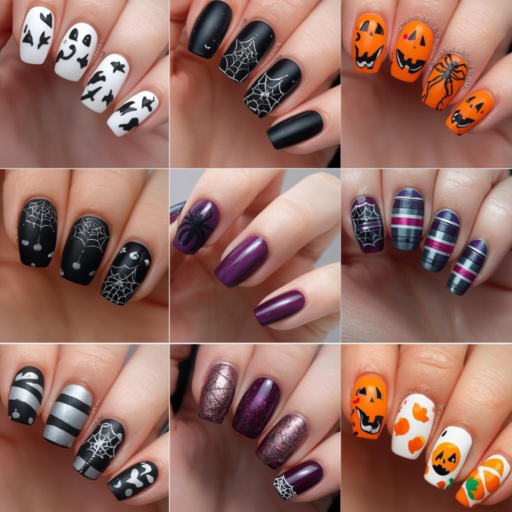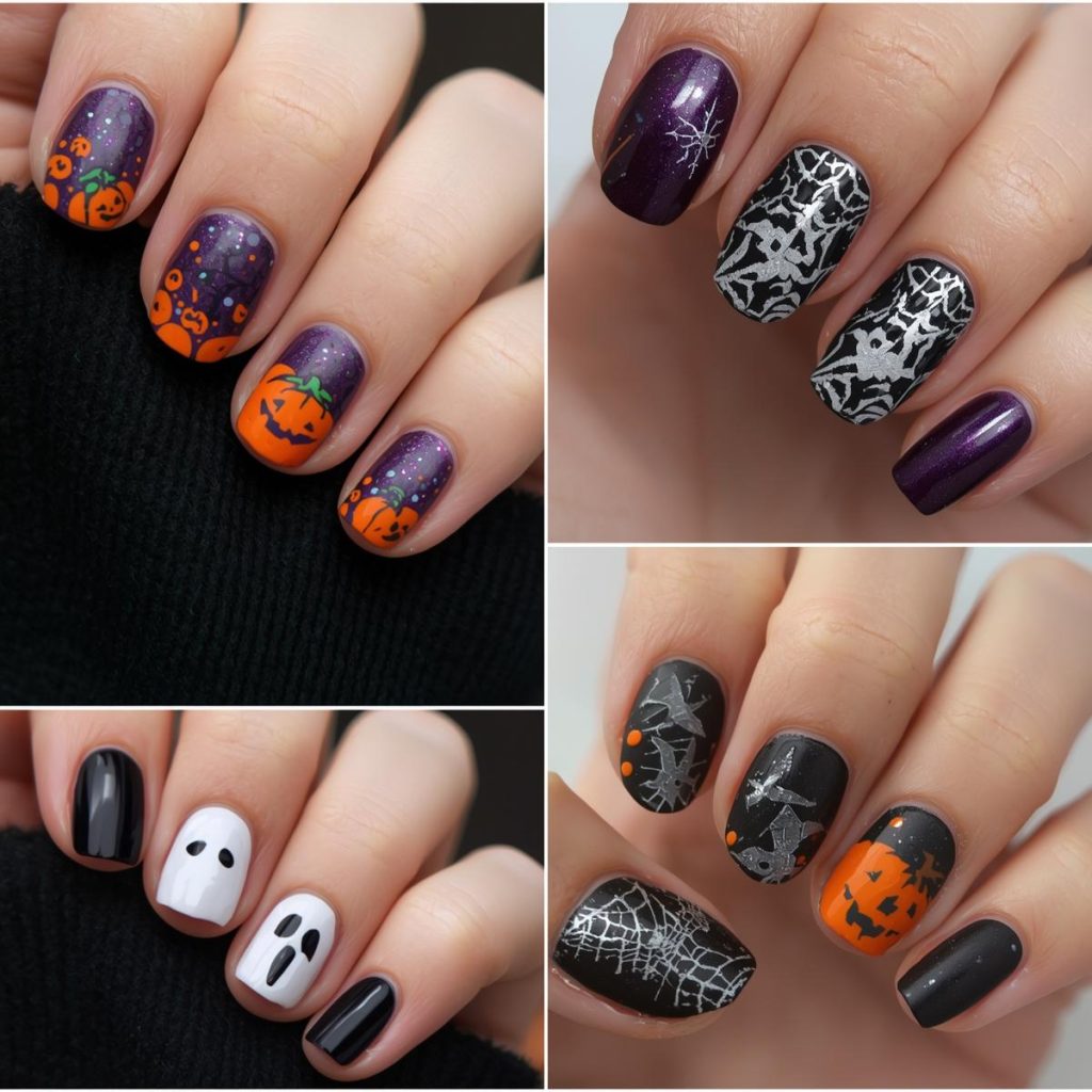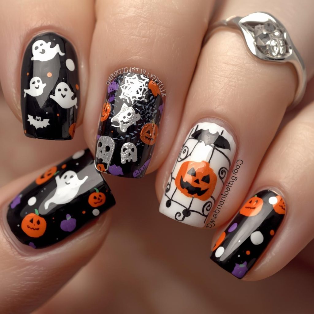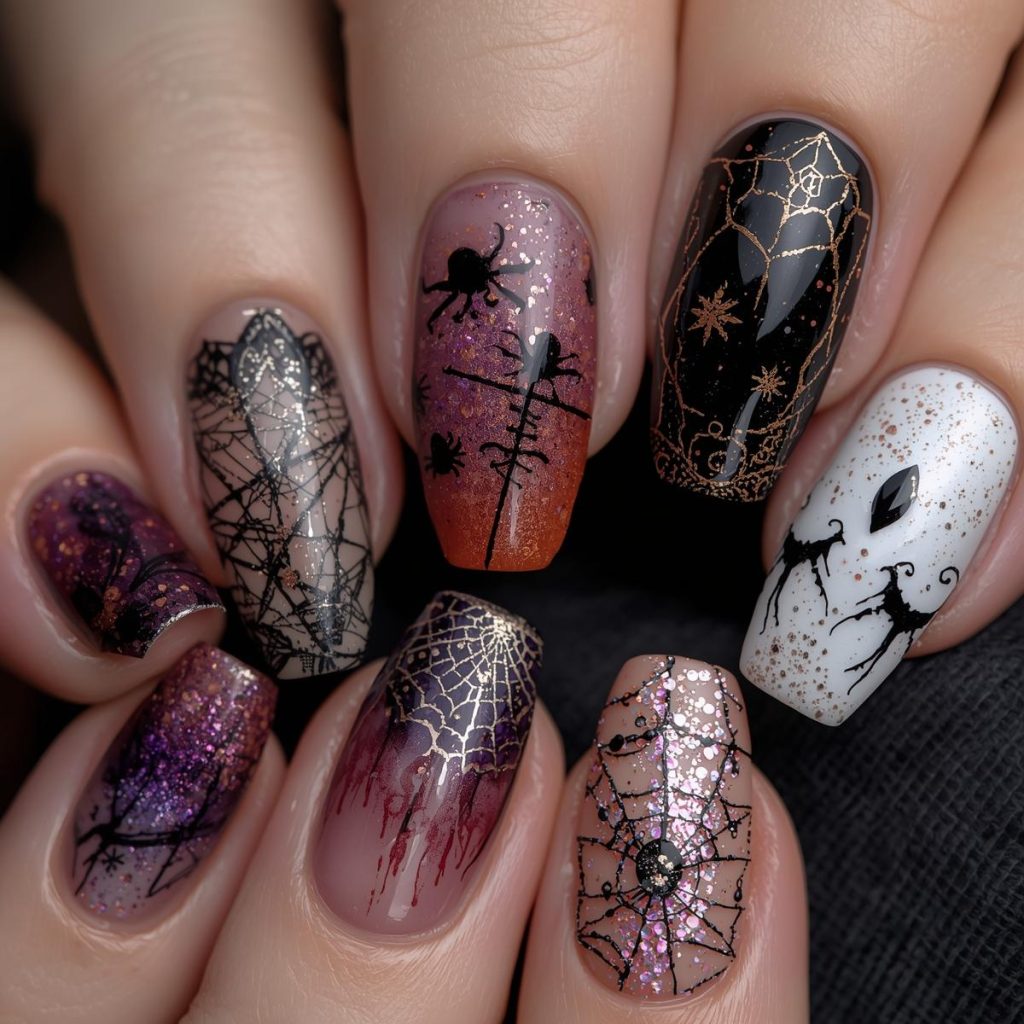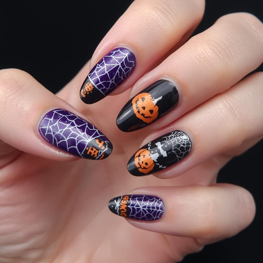 • Mismatched Halloween Nails: Each nail with a different design (pumpkin, bat, spider, etc.).